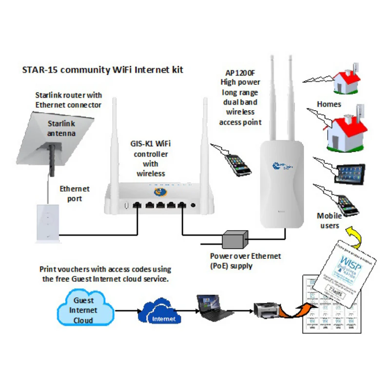 STAR-15 kit, provides free or paid WiFi Internet service for indoor and outdoor locations such as restaurants, bars and other types of businesses. Generate personalized WiFi access codes via the software installed in the controller. It works with any internet service provider (including Starlink).